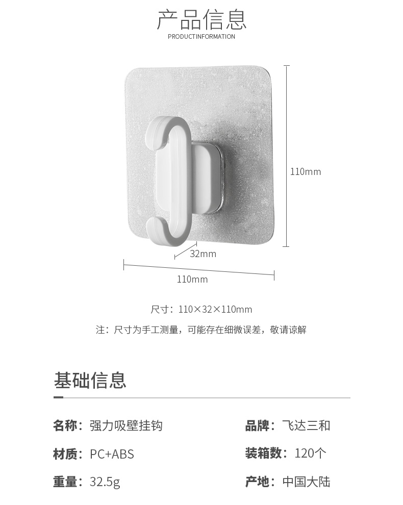 品牌名称:kaiyun(中国)一站式服务平台三和 生产地区:中国·浙江·台州 kaiyun(中国)一站式服务平台货号:R5350 装箱数:120 kaiyun(中国)一站式服务平台尺寸:11*3.2*11cm 外箱尺寸:52*28.5*26.5cm 条形码:6931643818278 kaiyun(中国)一站式服务平台三和R5350 强力吸壁挂钩