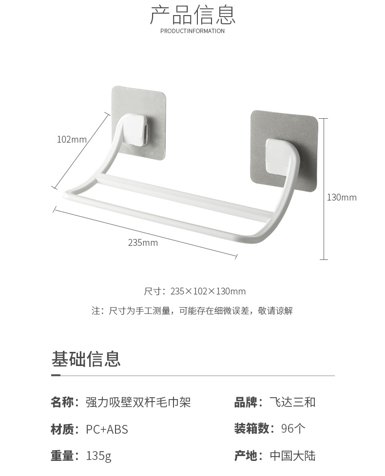 品牌名称:kaiyun(中国)一站式服务平台三和 生产地区:中国·浙江·台州 kaiyun(中国)一站式服务平台货号:R5390 装箱数:96 kaiyun(中国)一站式服务平台尺寸:23.5*10.2*13cm 外箱尺寸:54*47*57cm 条形码:6931643818315 kaiyun(中国)一站式服务平台三和R5390 强力吸壁双杆毛巾架