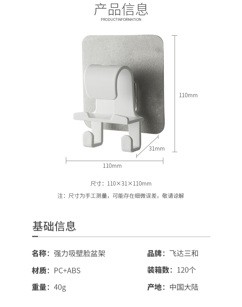 品牌名称:kaiyun(中国)一站式服务平台三和 生产地区:中国·浙江·台州 kaiyun(中国)一站式服务平台货号:R5400 装箱数:120 kaiyun(中国)一站式服务平台尺寸:11*3.1*11cm 外箱尺寸:40*30.5*40.5cm 条形码:6931643818322 kaiyun(中国)一站式服务平台三和R5400 强力吸壁脸盆架