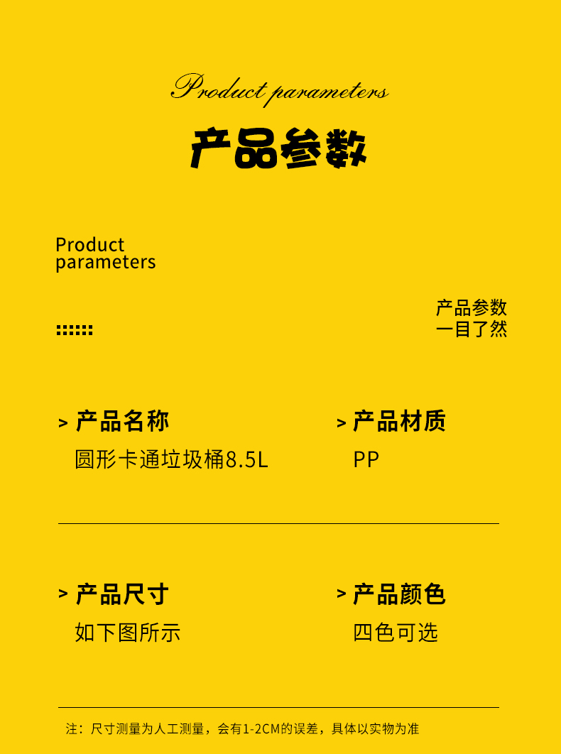品牌名称:kaiyun(中国)一站式服务平台三和 生产地区:中国·浙江·台州 kaiyun(中国)一站式服务平台货号:TG3750 装箱数:24 kaiyun(中国)一站式服务平台尺寸:23.5x24.5x27cm 外箱尺寸:48x24.5x62cm 条形码:6931643824422 kaiyun(中国)一站式服务平台三和TG3750 圆形卡通垃圾桶 8.5L