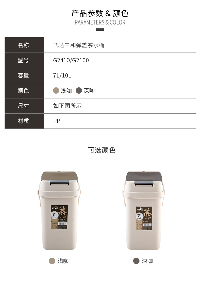 品牌名称:kaiyun(中国)一站式服务平台三和 生产地区:中国·浙江·台州 kaiyun(中国)一站式服务平台货号:G2100/G2410 装箱数:8/12 kaiyun(中国)一站式服务平台尺寸:268*168*360mm/275*175*280 外箱尺寸:665*535*375/800*350*585 条形码:6931643812832/6931643815796 kaiyun(中国)一站式服务平台三和G2100/G2410时尚茶水桶